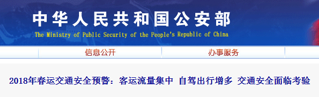2018年春运将于2月1日开始。春运是一年中人员流动规模最大、公路客运流量最集中的时期,也是道路交通事故的易发高发期。近日,公安部分析了近五年春运道路交通事故特点,对2018年春运交通安全形势进行了研判,并发出交通安全预警。 数据显示,近五年春运期间,一次死亡3人以上的较大交通事故年均发生97起,群死群伤事故发生率明显高于平日。2018年春运期间,多重不利因素叠加,道路交通安全面临严峻挑战。
