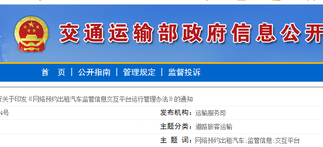 各省、自治区、直辖市、新疆生产建设兵团交通运输厅(局、委): 经交通运输部同意,现将《网络预约出租汽车监管信息交互平台运行管理办法》印发给你们。请结合各地实际,认真贯彻执行。 为加强网络预约出租汽车监管信息交互平台(简称网约车监管信息交互平台)的运行管理工作,规范数据传输,提高网约车行业监管效能,营造良好的营商环境,根据《网络预约出租汽车经营服务管理暂行办法》(交通运输部 工业和信息化部 公安部 商务部 工商总局 质检总局 国家网信办令2016年第60号)等相关规定,制定本办法。