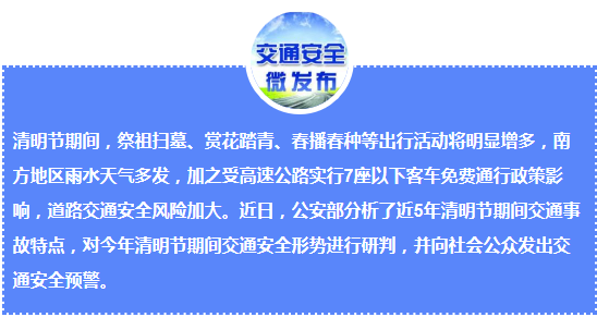 清明节期间,祭祖扫墓、赏花踏青、春播春种等出行活动将明显增多,南方地区雨水天气多发,加之受高速公路实行7座以下客车免费通行政策影响,道路交通安全风险加大。近日,公安部分析了近5年清明节期间交通事故特点,对今年清明节期间交通安全形势进行研判,并向社会公众发出交通安全预警。